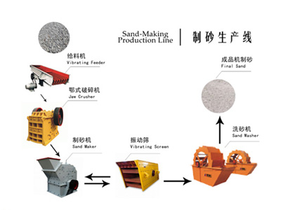 石料由振動給料機均勻地送到鄂式破碎機進行粗破,粗破后的物料由膠帶輸送機送入到制砂機進行進一步破碎,細碎后的物料被輸送到振動篩進行篩分,達到成品粒度要求的物料被送入洗砂機清洗,清洗后由成品輸送帶輸出即為成品;未達到成品粒度要求的物料從振動篩返回制砂機重新加工,形成閉路多次循環(huán)。成品粒度可按用戶的需求進行組合和分級。如果選用干法生產(chǎn)工藝,可配備粗細粉分離機和除塵設(shè)備。