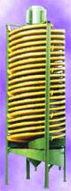 將螺旋溜槽立起,校準(zhǔn)垂直線,用鐵架或木頭固定在合適的位置,由砂泵將礦砂送到螺旋上頂兩個進料口處,加入補充水,調(diào)節(jié)礦槳濃度,礦槳自然從高往下旋流,在旋轉(zhuǎn)的斜面流速中產(chǎn)生一種慣性的離心力,以礦砂的比重、粒度、形狀上的差異,通過旋流的重力和離心力的作用,將礦與砂分開,精礦流入精礦斗用管道接出,尾砂流進尾砂斗用管道接到砂池,再用砂泵排走,完成了選礦的全過程。